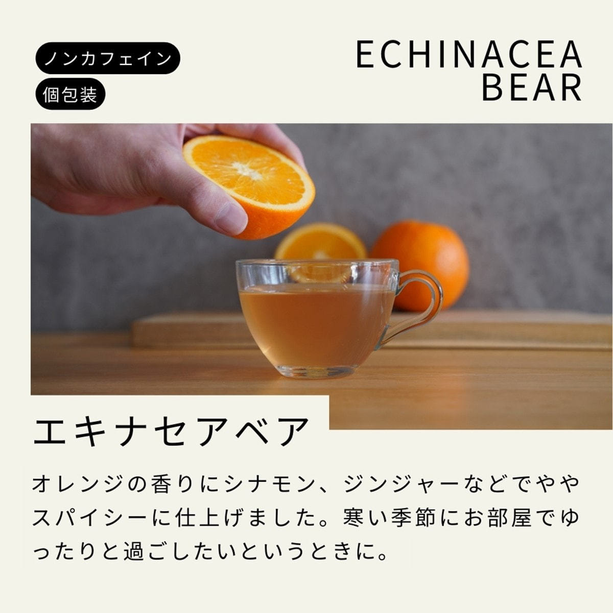 エキナセア、アップル、ローズヒップ、ブラックベリーリーフ、シナモン、ハイビスカス、ジンジャー、オレンジピール、クローブ、チコリールート/香料、クエン酸